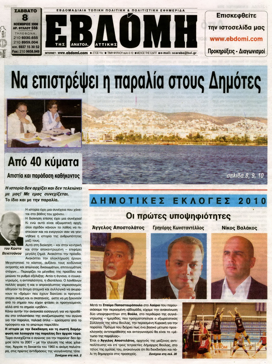 Μετά το Σταύρο Παπασταυρόπουλο στο Λαύριο που παρουσιάσαμε την περασμένη εβδομάδα, είχαμε την ανακοίνωση δύο υποψηφιοτήτων στη Βούλα, στο περιθώριο της συγκέντρωσης - ημερίδας, που πραγματοποίησε ο εξωραϊστικός Σύλλογος της κάτω Βούλας, την περασμένη Κυριακή για την παραλία. Πράγμα που δείχνει πως ένα βασικό μέτωπο προεκλογικής αντιπαράθεσης και ανταγωνισμού θα είναι το «μέτωπο της παραλίας».